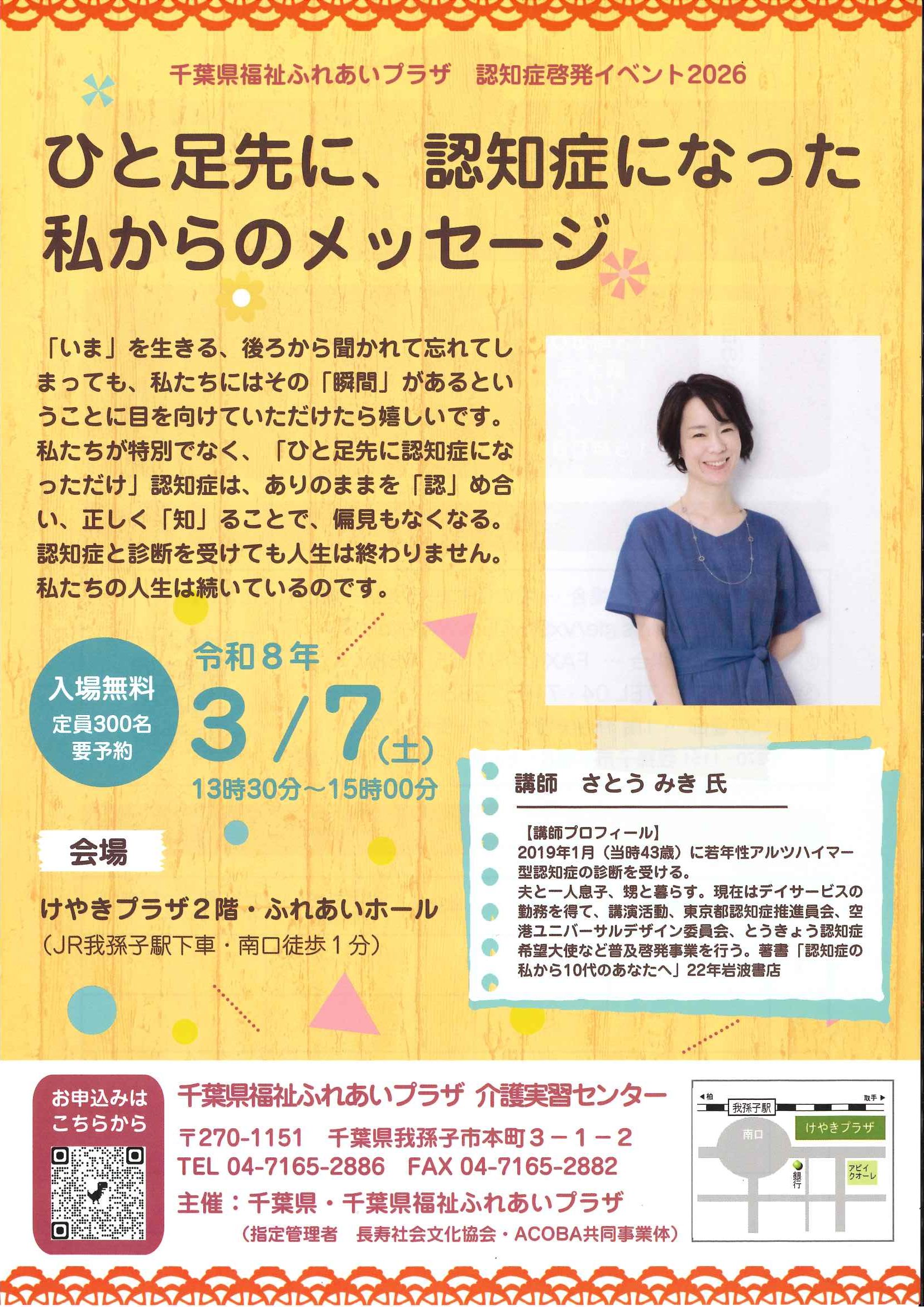 3/7(土)13:30~15:00 けやきプラザ2階ふれあいホールにてとうきょう認知症希望大使として講演などを行っているさとうみきさんが講演する。